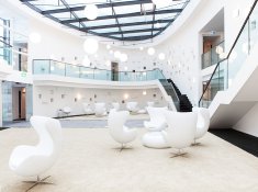 Das ca. 340 Quadratmeter große imposante Gebäudeinnere, um das sich insgesamt 77 Zimmer und Suiten auf zweieinhalb Etagen ringförmig anordnen, ist Aufenthalts- und Entspannungsoase zugleich. Es wird in acht Metern Höhe von einem gewölbten Glasdach überdeckt, das einen ungestörten Blick gen Himmel ermöglicht und das ansonsten fensterlose Atrium mit Licht durchflutet. Besucher erleben hier ein einzigartiges großzügiges Raumgefühl bei angenehmen vorgewärmten Frischluft-Temperaturen. Störende Lüftungsgeräusche oder Zugluft sucht der Gast an diesem inspirierenden Ort vergebens, denn das Atrium wird von AIRCONOMY®, einem System zum heizen, lüften – und auf Wunsch kühlen – optimal klimatisiert. Das Besondere: Für die Besucher ist das multifunktionale Flächenheiz- und Lüftungssystem, das eine Warmwasser-Fußbodenheizung und eine kontrollierte Be- und Entlüftung mit Wärmerück- gewinnung kombiniert, völlig unsichtbar im Boden installiert. Der aufmerksame Gast bemerkt lediglich 37 kleine Lüftungsschlitze, optisch kaum wahrnehmbar, im Fußboden vor den Wänden – mehr nicht!