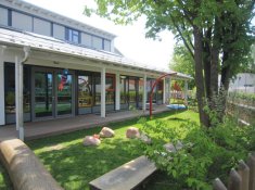 Die Räume im Obergeschoss sind von den einzelnen Gruppenräumen aus zugänglich und stehen zur flexiblen Nutzung bereit. Durch die in den Räumen eingebaute Spielpodest-Landschaft und die gemeinsame Dachterrasse wird den Kindern eine Vielfalt an Bewegungs- und Rückzugsmöglichkeiten geboten. Im Untergeschoss befindet sich neben der zum Tiefhof ausgerichteten 5. Gruppe ein stützenloser, teilbarer Mehrzweckraum, welcher von beiden Einrichtungen genutzt werden kann. Die Gestaltung der Außenbereiche ist geprägt von vielfältigen Spiel- und Erfahrungsmöglichkeiten aus Naturmaterialien.