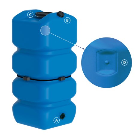 Orificio de conexión (entrada, salida) de rosca interior S75, con adaptador a 2” rosca interior con junta plana y tapón de 2” rosca exterior con junta tórica.